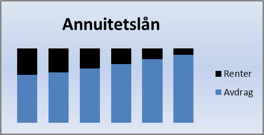 Dette fører til at rentene er høye i starten når restlånet er stort og at rentekostnadene så blir stadig mindre etter som lånet minsker. Rentene vil da utgjøre den største delen i begynnelsen mens andelen avdrag er lav. Et annuitetslån betyr at du betaler en fast sum hver måned.